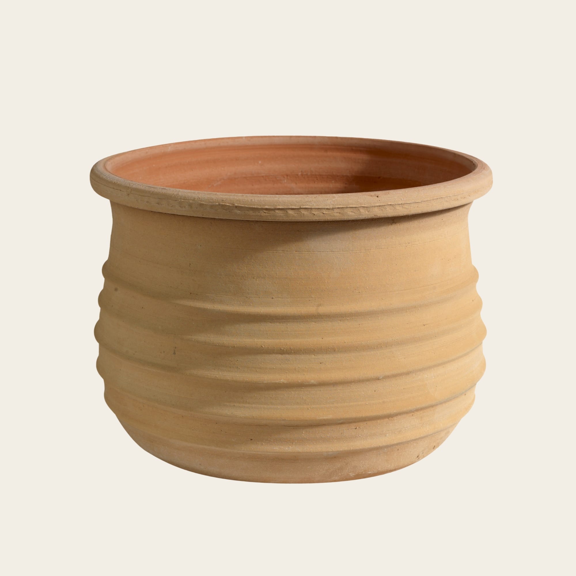 The Vamos is a Pots & Pithoi favourite. Despite being small in size there is generous planting room for early spring bulbs or lavender. The hand thrown bands provide a traditional Cretan finish. The perfect pot for displaying in a group.